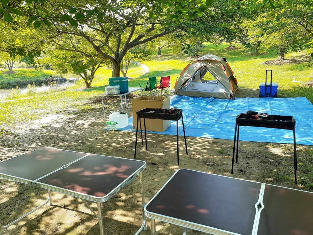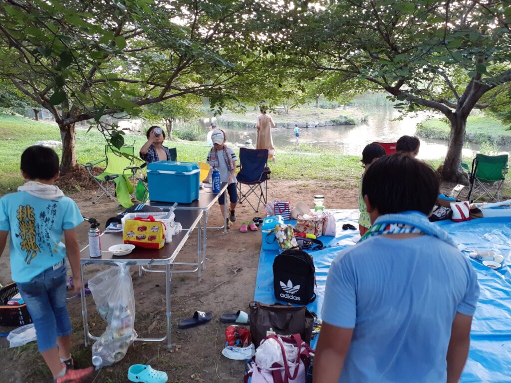 今回は新入生・新入会者歓迎会で子ども達に意見を聞いたところ、「水遊びをやりたい」の意見になったので、百間川のせせらぎ広場で水辺遊びとバーベキューを企画しました。