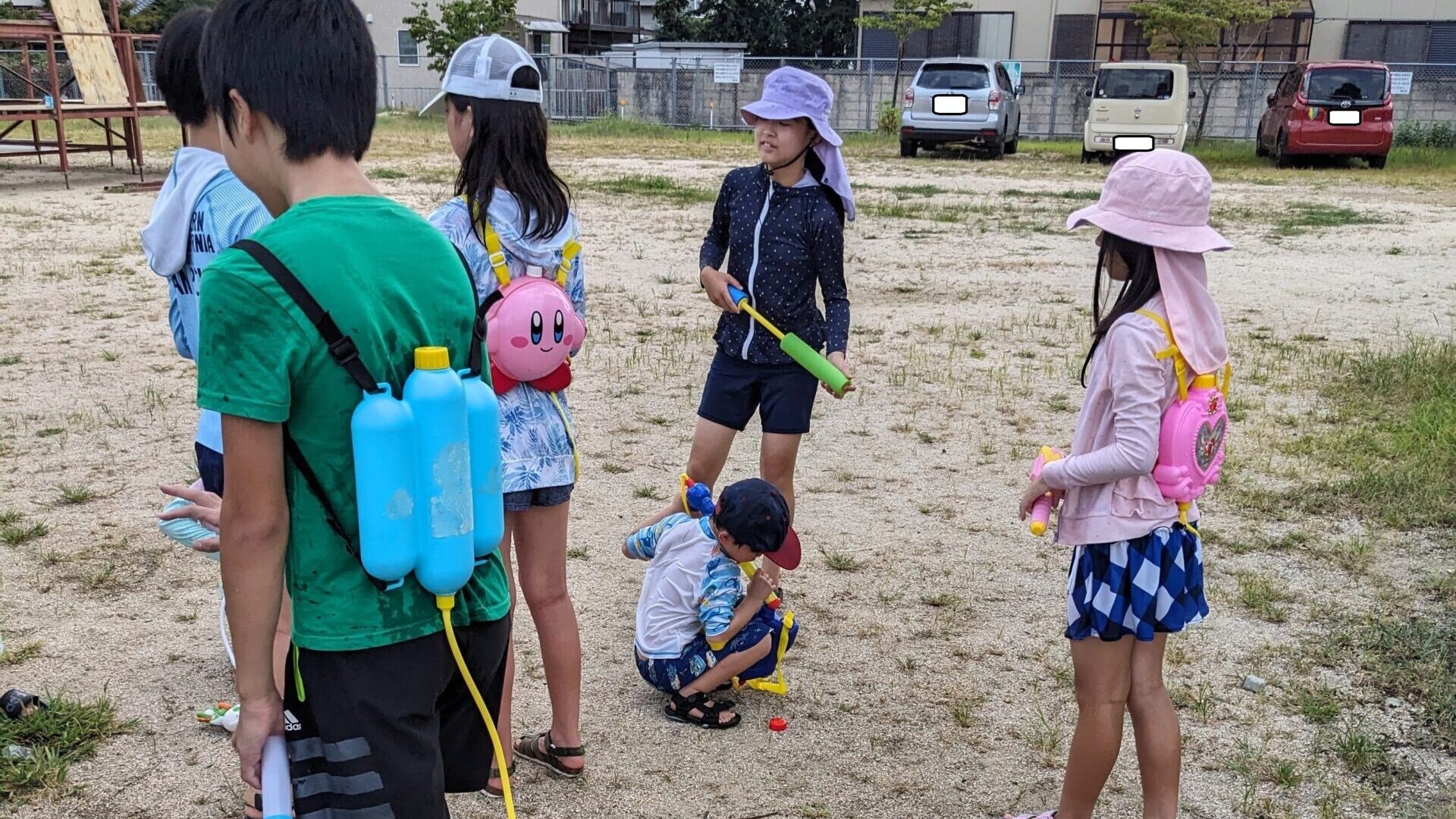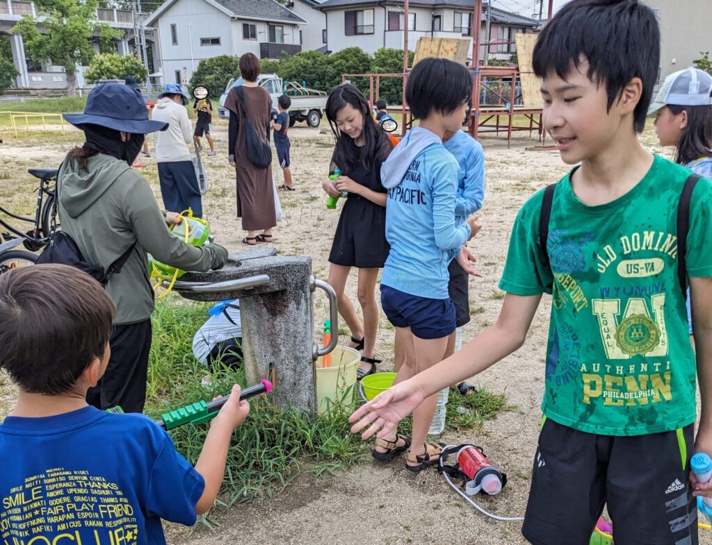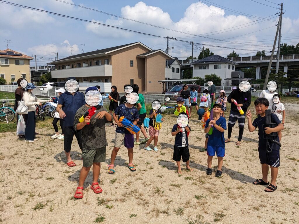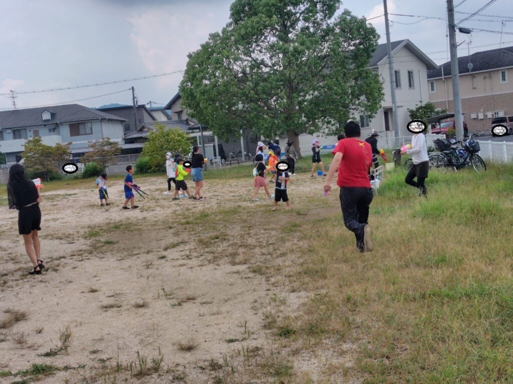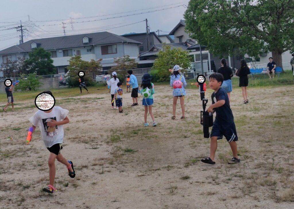 「近くの公園でみんなで水鉄砲で遊ぶ」だけのイベントですが、子ども23人、大人4人での水鉄砲遊びは大盛り上がりでした。