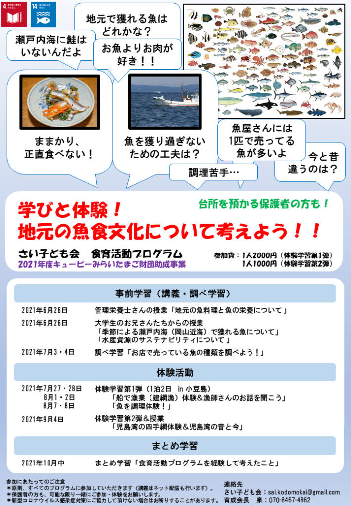 今後の食育活動プログラムとして「スーパーマーケットで売っているお魚調べ」、「小豆島での漁業体験・魚調理体験」、「児島湾での四手網漁体験」、「まとめ学習」を予定しています。