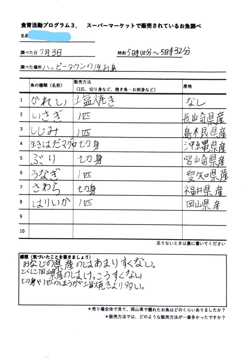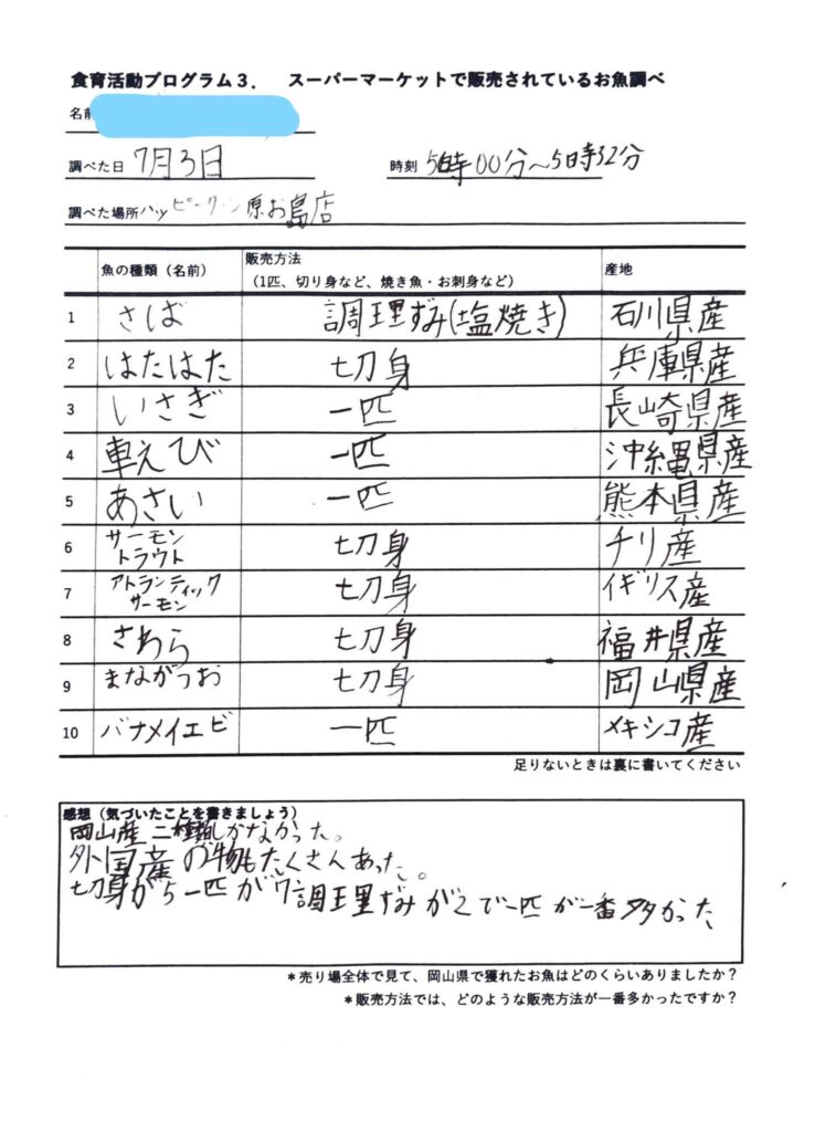 先週(6月26日)の授業に引き続き、7月3日(土)・4日(日)でキューピーみらいたまご財団助成事業 食育活動プログラム3.「スーパーマーケットで売っているお魚調べ」を実施しました。